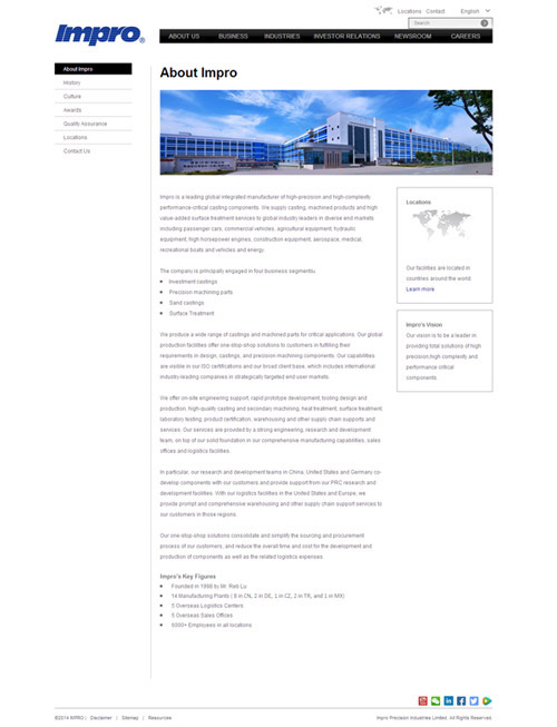 Impro is a leading global integrated manufacturer of high-precision and high-complexity performance-critical casting components. We supply casting, machined products and high &#118alue-added surface treatment services to global industry leaders in diverse end markets including passenger cars, commercial vehicles, agricultural equipment, hydraulic equipment, high horsepower engines, construction equipment, aerospace, medical, recreational boats and vehicles and energy.