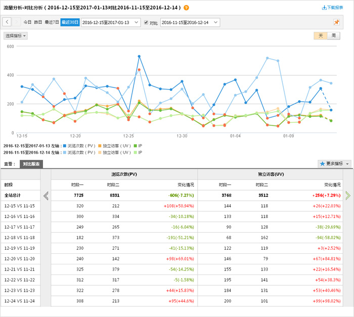 3、流量分析:一个月浏览次数(PV)、独立访客(UV)、IP数据对比(统计软件CNZZ)